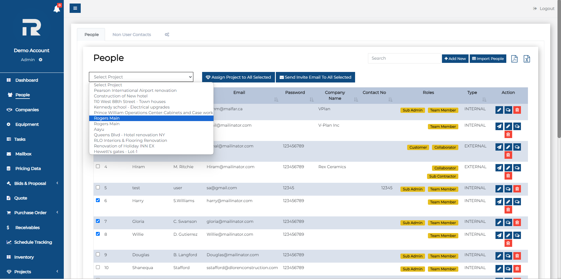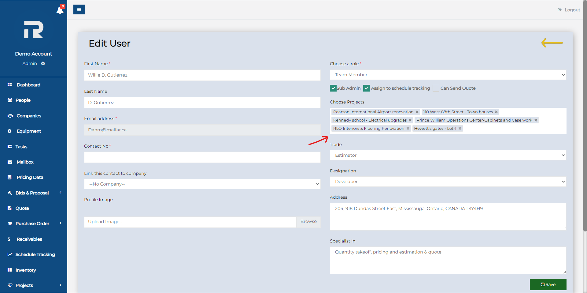Upon creating a database of Users and Projects. Users can be assigned to the projects that they work on. This can be done from the user profile.